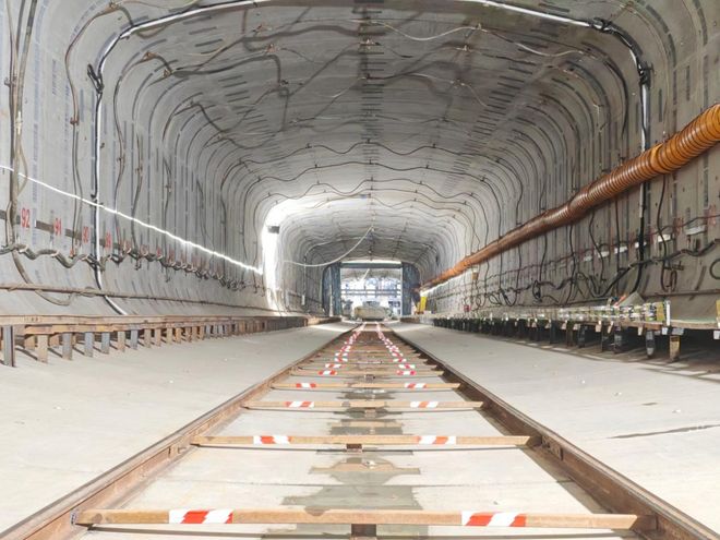 为破解复杂地质挑战,建设团队总结右线始发经验并优化技术方案,采用“三轴搅拌”端头加固处理工艺,结合钢套筒接收密封系统,筑牢始发接收安全防线;创新应用“遇水膨胀止水条”防水体系,实现管片防水提升;配置智能渣土称重系统与盾尾间隙测量装置,通过泡沫—膨润土双液注入技术破解黏土结饼难题;优化盾构机姿态控制系统,采用千斤顶分区调压与激光导向定位技术,精准控制小半径转弯偏差,实现动态调参、安全穿越。