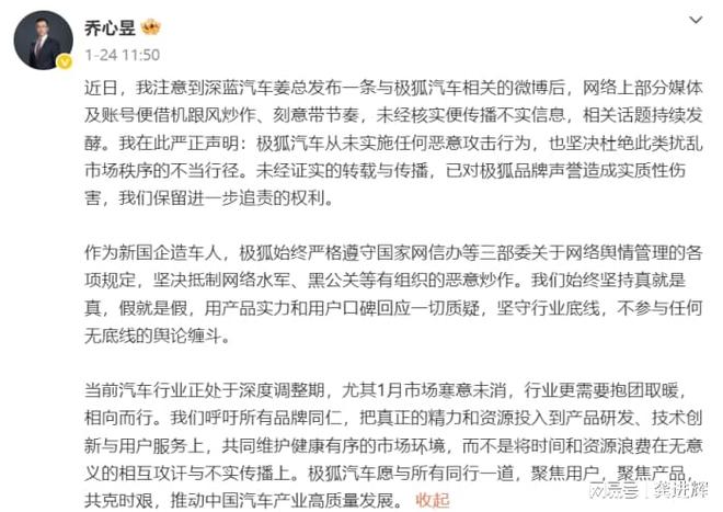 对此,极狐品牌用户运营中心副总经理乔心昱表示,极狐汽车从未实施任何恶意攻击行为,也坚决杜绝此类扰乱市场秩序的不当行径。“未经证实的转载与传播,已对极狐品牌声誉造成实质性伤害,我们保留进一步追责的权利。”