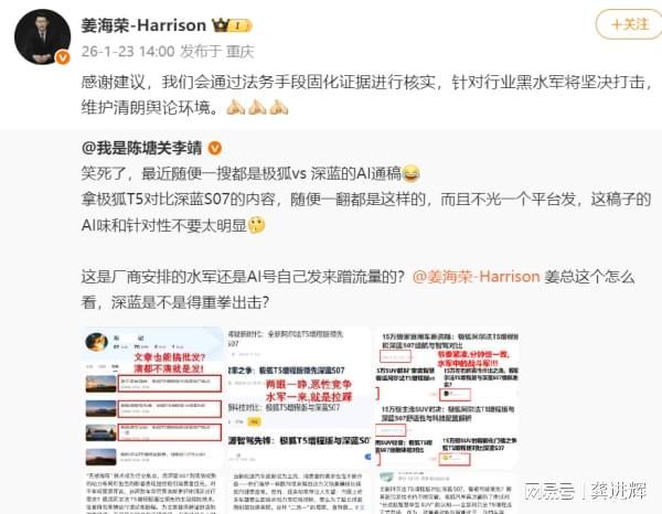 “这是厂商安排的水军还是AI号自己发来蹭流量的?”该网友感到疑惑,并@深蓝汽车CEO姜海荣怎么看,询问深蓝是不是得重拳出击。对此,姜海荣回应道,“感谢建议,我们会通过法务手段固化证据进行核实,针对行业黑水军将坚决打击,维护清朗舆论环境。”