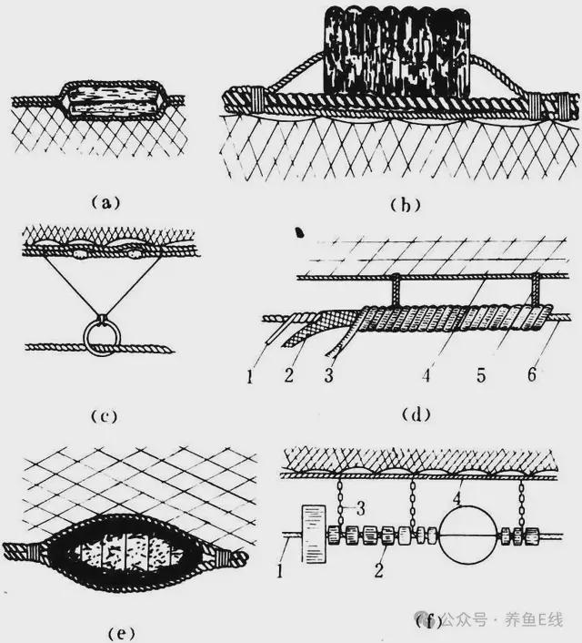 为使网具保持一定的作业形状和达到作业要求,分别装配浮子、沉子、挡杆或底环等属具。浮子、沉子的主要装配方式是将其夹入、穿入或直接结缚在浮、沉子纲上(图a、b、c、d)。拖网的沉子纲有的用钢丝绳外包布条、旧网衣和绳股制作,或者将钢丝绳穿入橡胶、塑料滚轮制成。再用吊纲(链)或通过水扣绳与下缘纲相连(图e、f)。