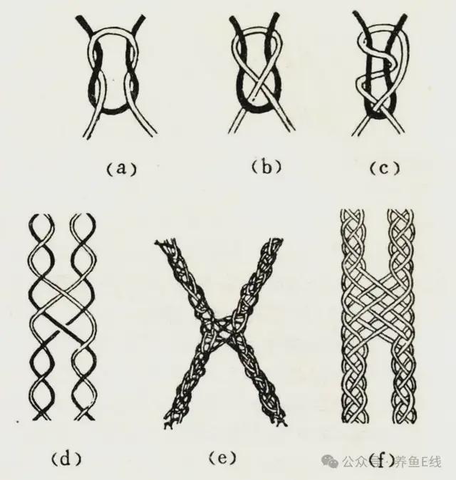 目脚间的连接结构称网结或连接点。其主要作用是限制网目尺寸和防止网目变形,是决定网片质量优劣的重要因素之一。良好的网结应牢固,当拉紧任何一根目脚时,不产生滑动而变形。网结的牢固程度称结牢度,取决于网结类型和系紧程度。合成纤维网片需要热定型处理,提高网结牢度。网结类型有活结、死结和双死结等,连接点类型有绞捻、经编和辫编等(见图)